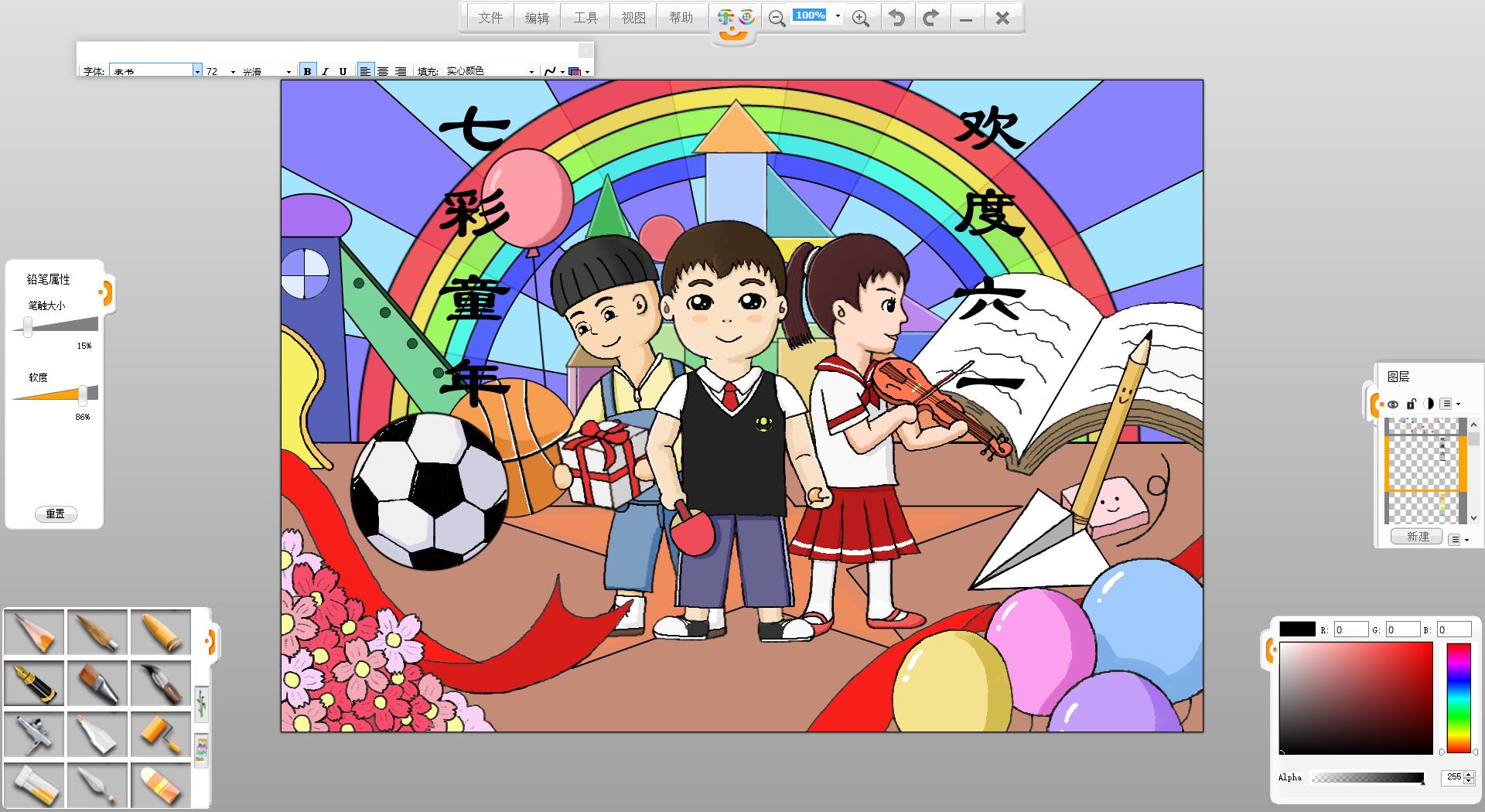 23.使用工具菜單下的文本工具,打出“七彩童年”“歡度六一”兩行字,調節合適的字體和大小。