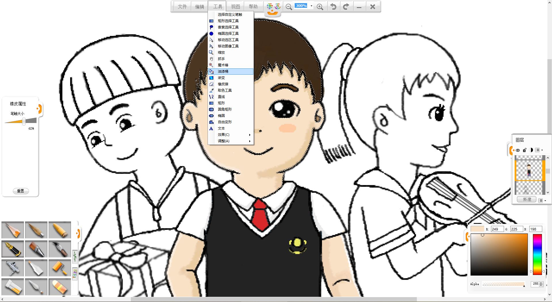 9.開始為人物上色。使用工具菜單下的魔術棒工具選擇閉合區域后,在新圖層中使用油漆桶工具進行上色,再使用鉛筆工具補充細節。