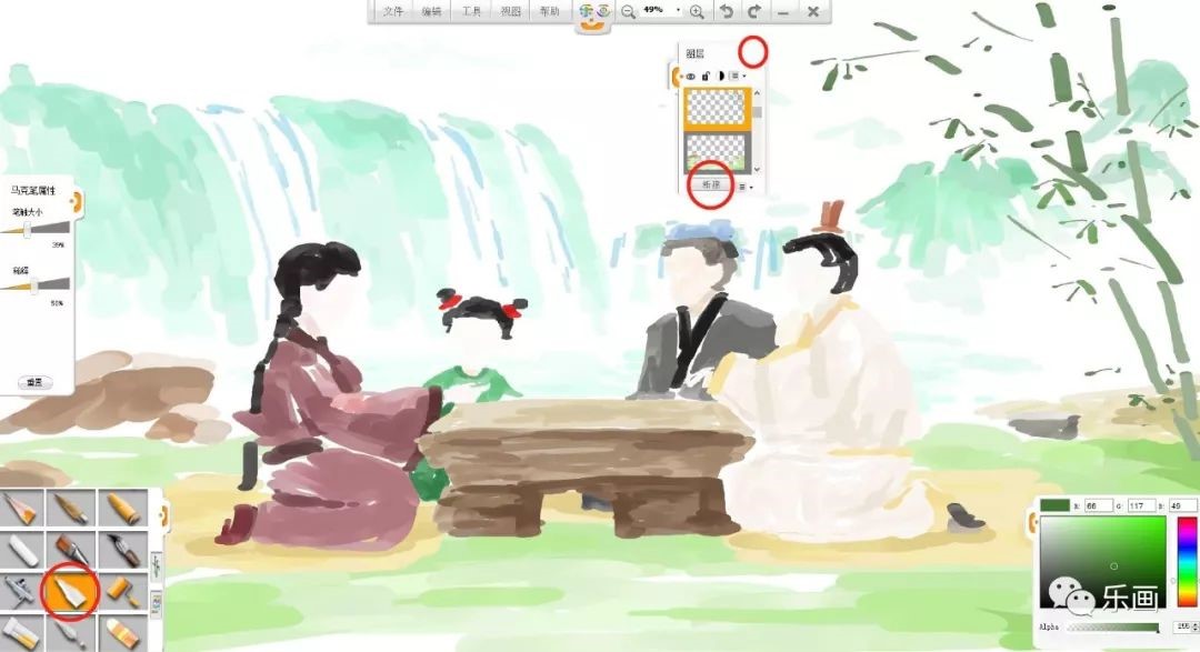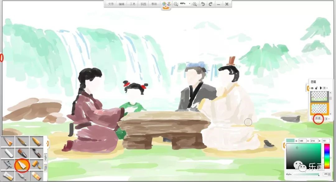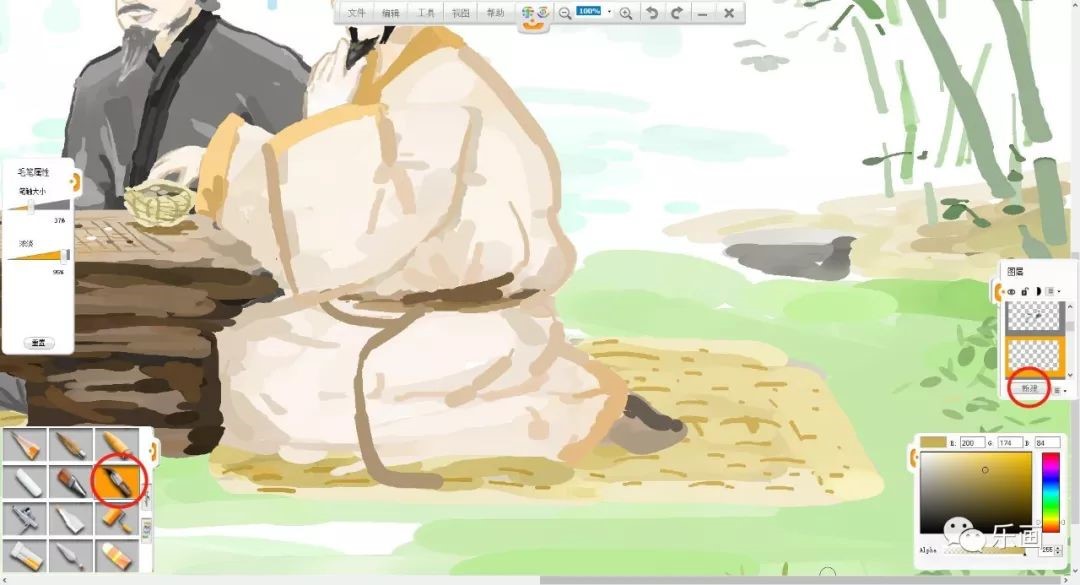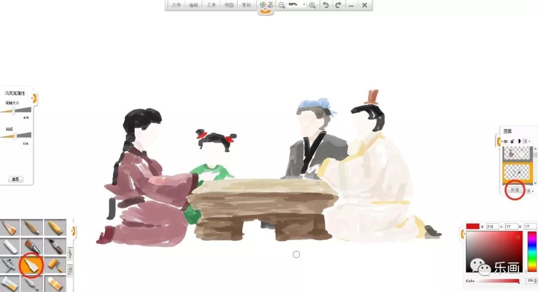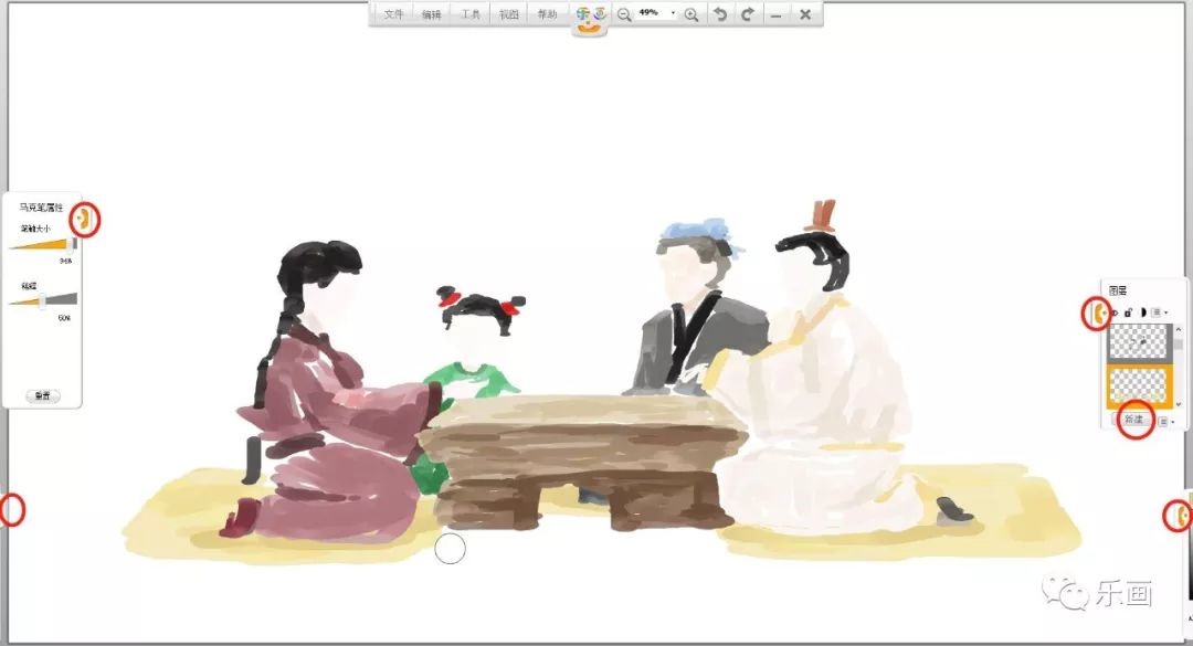 再新建一個圖層,繪制對弈夫婦二人的大概形象。考慮前后關(guān)系,石桌會擋住人物,所以新建的圖層要放在石桌圖層下面,圖層順序可以用樂畫電子畫筆筆尖或鼠標(biāo)點住圖層,上下拖動調(diào)整,也可以使用圖層面板工具“上移”或“下移”。