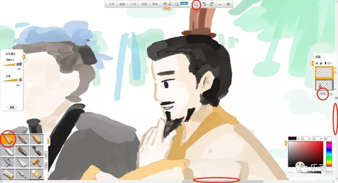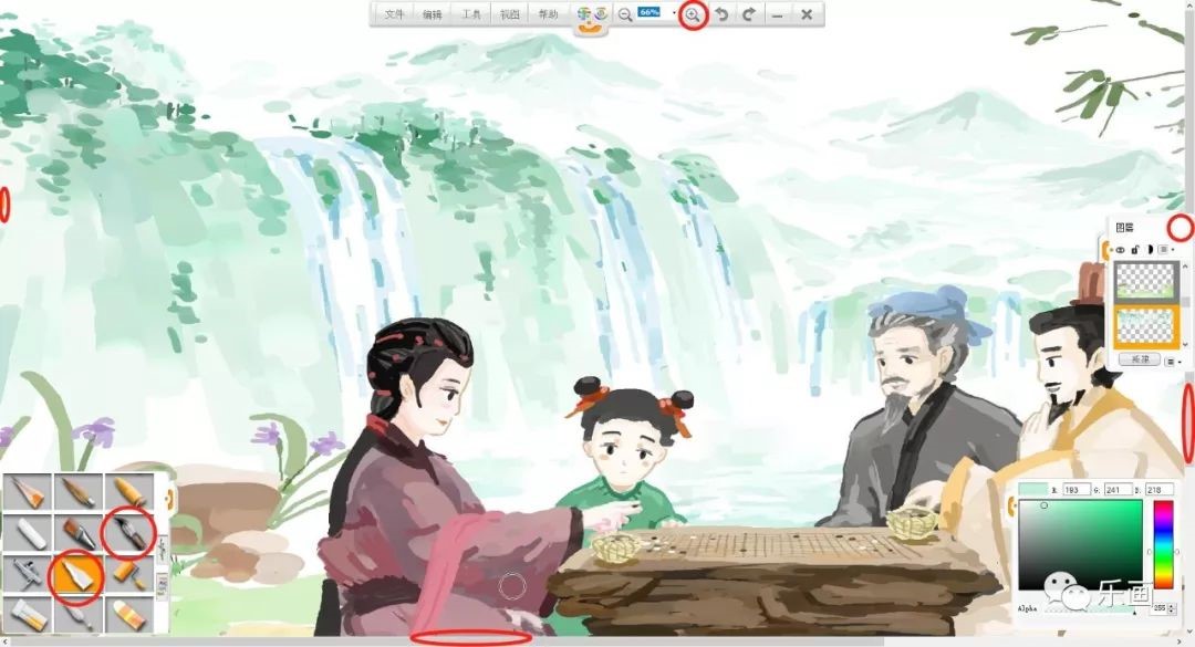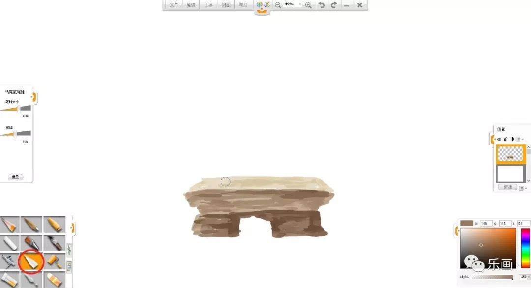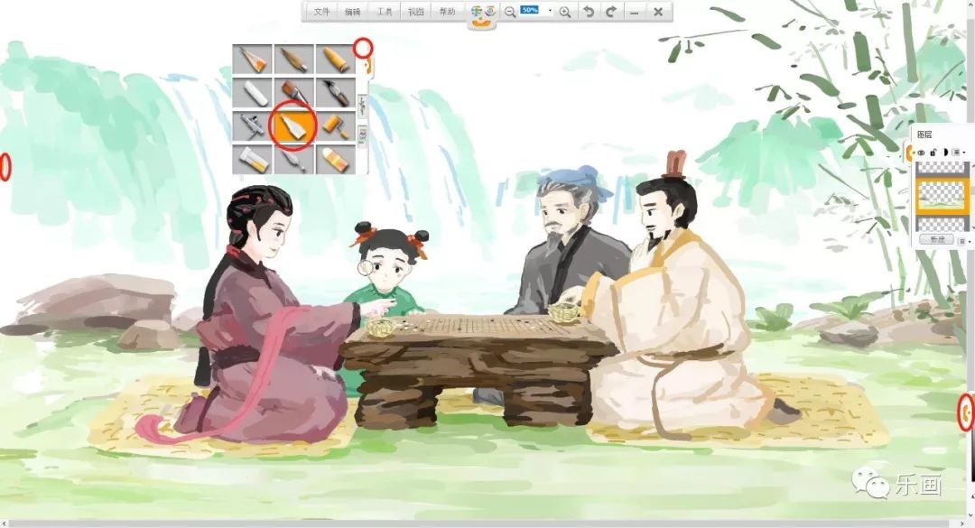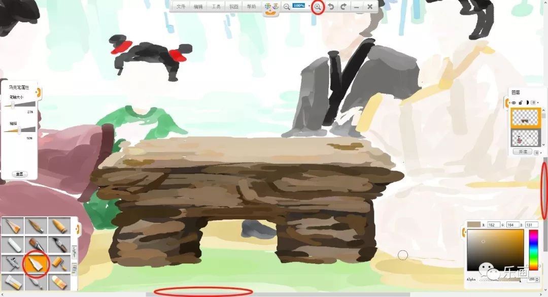首先使用畫面上方的工具欄中的放大工具,將圖像放大,然后拖動下方滑塊和右側(cè)滑塊(也可以嘗試使用樂畫電子繪畫板面板左側(cè)四個快捷鍵中的“抓手”按鍵,使用繪畫筆的筆尖或鼠標(biāo)拖動畫布圖像)。找到石桌位置,使其相對處于畫面中央,然后點擊石桌圖層,使用馬克筆筆觸細化石桌,刻畫圍棋石桌的紋理和質(zhì)感。