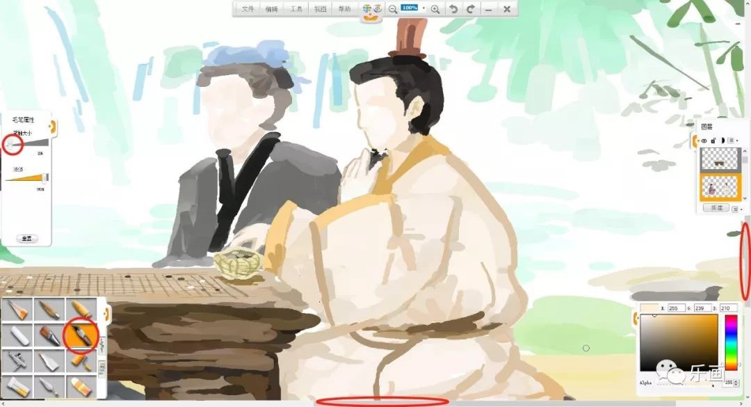 接下來選擇點擊到對弈夫妻的圖層,用毛筆筆觸精細刻畫人物的服裝,頭冠,面部,手和輪廓,毛筆筆觸顏色可以覆蓋之前馬克筆畫的大形,再用橡皮擦筆觸擦掉不需要的部分。