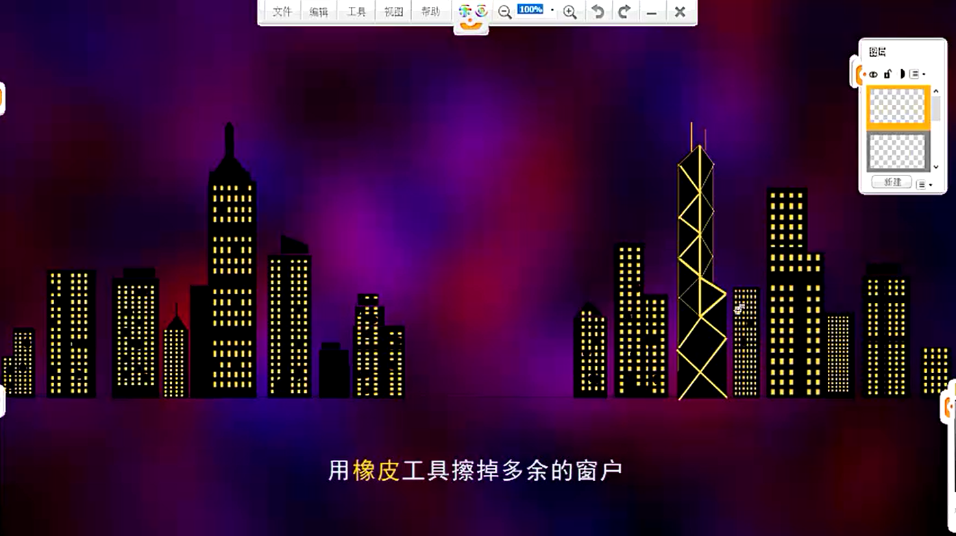 15、再用橡皮擦筆觸,擦掉部分小窗格亮點(diǎn),形成錯(cuò)落開(kāi)關(guān)燈光的窗格景觀