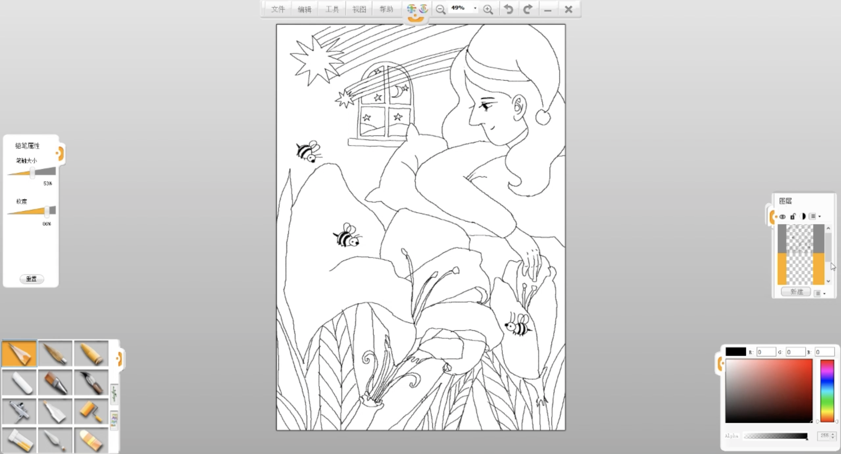 09、給流星和窗戶上色,因為流星在畫面中屬于背景的一部分,所以選擇顏色的時候,不要用明亮的黃色,用姜黃色即可。