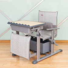 4、課椅規格及材料:寬460mm*深380mm*(座椅面高360mm-460mm可手搖升降調節)±5mm,椅背可調最大傾斜度150°。座靠面料采用環保PE藤質材料。課椅座面前部背面設置寬70mm的丙綸絲編織加強帶,增強課椅座面的承受力。椅下設置370*330*190mm±3mm的PP材料的貯物箱,貯物箱底下前部設置雙滑輪,后部設置滑塊,與課椅下雙滑軌(ABS材質,規格315*30*20mm)的卡位裝置結構配合,貯物箱可前后自由限位滑動,可脫卸。