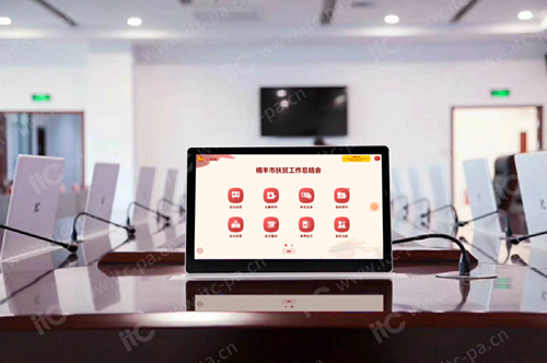 會議室的itc無紙化會議系統,采用雙屏帶升降麥的方案,話筒與屏幕一起升降,不占用桌面使用面積,會議室整體效果美觀大方。同時,為會議提供高保密性保障。