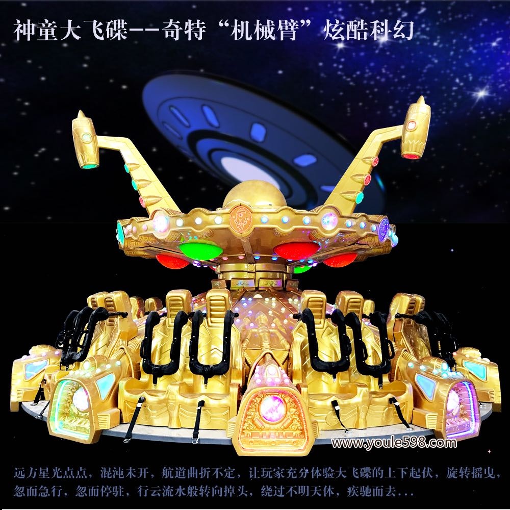 產品詳細介紹大型游樂設備神童大飛碟: 采用高檔玻璃鋼材料,堅實、安全又美觀,配以奢華金色,彰顯尊貴典雅。戶外游樂設備飛碟造型炫酷獨特,設計成上下兩層,上層的高效光能轉化板讓其能源源源不斷,下層更加龐大圓潤,精密玲瓏的操控室位于正中央,被外部巨型太空座艙所環繞”。 獨特的神秘飛碟造型、炫彩靚麗的外觀、旋轉起伏搖曳不定的運行方式以及各種引人遐思的太空元素,該游樂設備投放之后維護方便,便于經營,兒童游樂場投放新設備神童20座大飛碟,拉動您的游樂場人氣,帶來新一輪的收益增長。運行特點:起伏+旋轉+逆轉+激情速度。 打造游樂設備差異化,增加兒童樂園設備的運動趣味性,神童游樂開發出一種先進的游樂設備偏心旋轉技術,應用到全新的20座飛碟產品之上,讓玩家乘坐體驗感成倍增加。兒童游樂設備大飛碟采用全新的全齒輪傳動方式,實現能量高效率轉化,同時設備運行更穩定,更安全。 公司擁有專業的研發、設計、生產、銷售、營銷策劃及售后團隊,有著多年的電玩城的建設規劃、全套的營運管理經驗;擁有近10年淘氣堡、主題樂園的規劃設計及全套運營管理經驗;公司強大的售后技術服務團隊,為客戶提供24小時的全天候咨詢、指導服務。真正理解客戶的需求,真正的幫助客戶得到所需, 互利共贏,致力于讓每一位選用我們產品的客戶成功創造財富,收益翻番。