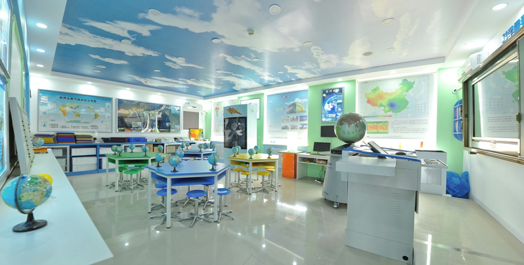 自然地理教室從整體到局部,側重地球內外力作用的表現及水圈的基本特點,主墻面:兩幅彩色語音地圖(中國和世界)莊嚴大氣,海量信息,滿足學生查詢需求,頂部:長江、黃河兩條巨龍蜿蜒奔騰,側墻上:地球內外力作用的具體表現歷歷在目,展柜上18種地貌模型形象生動,同學們可以把自己的觀察結果與現實生活相結合,運用3D打印技術,把家鄉的地貌景觀打印成模型和同學們分享。擺放在教室中部的兩臺大型試驗設備“水土流失試驗臺和地質構造形成過程試驗臺”,可以模仿或再現水土流失、不同構造地貌的形成過程,如果改變實驗參數、實驗條件等能夠得出多種不同的結論。通過參與實驗活動,不但能激發學科興趣,幫助學生們理解、鞏固學科專業知識,培養嚴謹的科學態度和科學素養,而且有助于學生們正確認識地理環境各要素之間相互影響、制約的微妙關系,從而深刻理解自然地理環境具有整體性與差異性的顯著特點。
