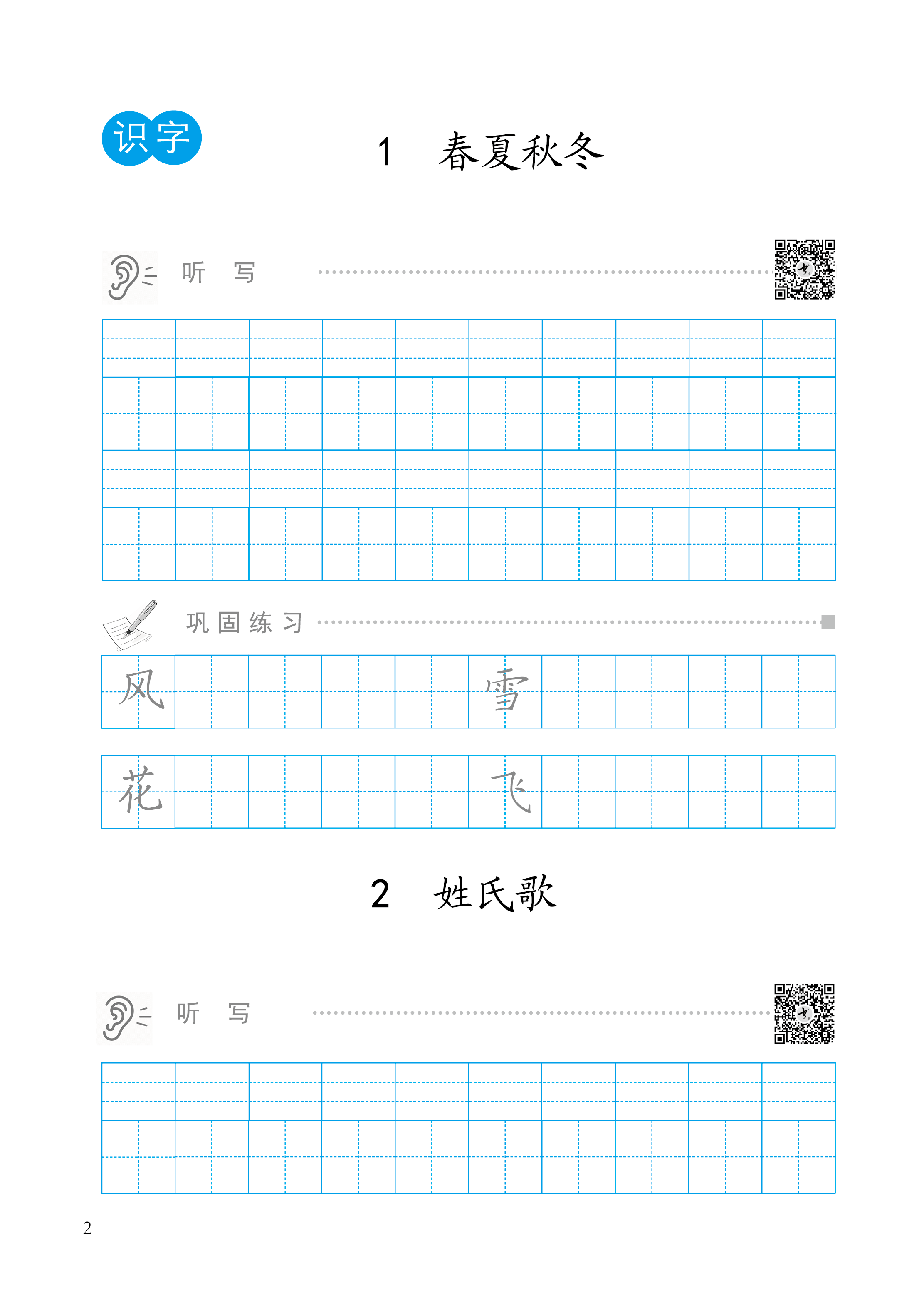 硬筆寫字課與小學(xué)語文課本同步,分為一至六年級上下冊,共計(jì)12冊。內(nèi)容包含控筆訓(xùn)練、拼音、筆順、例字形狀分析、占格、描紅、臨寫、組詞拓展等內(nèi)容。