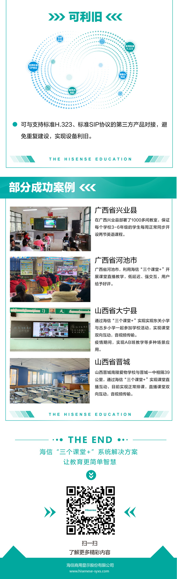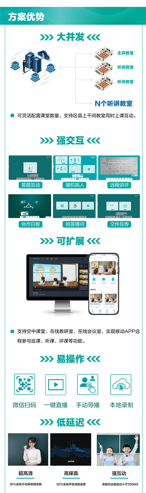 基于“三個課堂”教育政策基礎下的海信“三個課堂+”系統(tǒng)解決方案。全新的海信“三個課堂+”系統(tǒng)解決方案打破傳統(tǒng)“1托3”限制,建立多間“1托N”教學子系統(tǒng),區(qū)域間可實現(xiàn)千間教室同時在線互動學習。該方案不僅可滿足專遞課堂,名師課堂、名校網(wǎng)絡課堂的“三個課堂”的場景應用,同時也可滿足遠程會議、空中課堂、在線教研、“四點半工程”、巡課督導等應用需求。最新版本還創(chuàng)新性的提供了“遠程講評”“答題互動”等功能,搭配協(xié)作白板、隨機挑班、搶答等互動工具,打造趣味性課堂互動模式,讓主講老師充分關注到聽講班級的每位學生,即使相隔千里,猶如置身同一課堂。