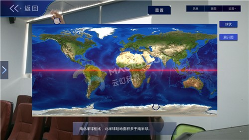 云幻科教VR地理仿真實驗資源通過《麥哲倫航行》故事視頻引入,吸引學生注意力。后續(xù)通過虛擬仿真技術模擬地球模型、地球儀等內(nèi)容進行知識教學,互動操作猶如將地球置于手中,知識可視化、操作趣味化、模式多樣化,集中學生注意力,活躍課堂氣氛,提高教學效率。