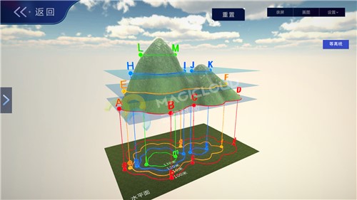云幻科教VR地理仿真實驗資源制作等高線的地形模型,使用不同顏色標注不同海拔的等高線,便于學生理解等高線地形圖的繪制原理,通過不同的地形模型,引導學生認識各種地表形態(tài)的名稱、特點,輕松學習地理知識。