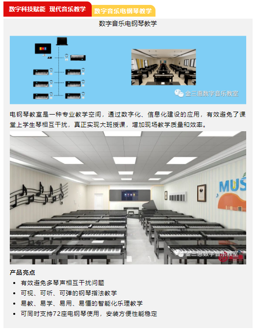 金三惠提供一站式「新常態音樂教室解決方案」「數字音樂教育綜合解決方案」,熱銷產品有:數字音樂教學軟件、美育測評訓練平臺、電鋼琴/電子琴教學管理軟件、電鋼琴教室、智慧音樂素養教室、數字電教板、各大類音樂器材、音樂教學設備等。為區域音樂教育提供管、教、學、評、練綜合平臺,打造智慧平臺+智能硬件+數字資源+智能管控+教學評價為一體的全場景學習生態,實現區域數字化音樂教育轉型。