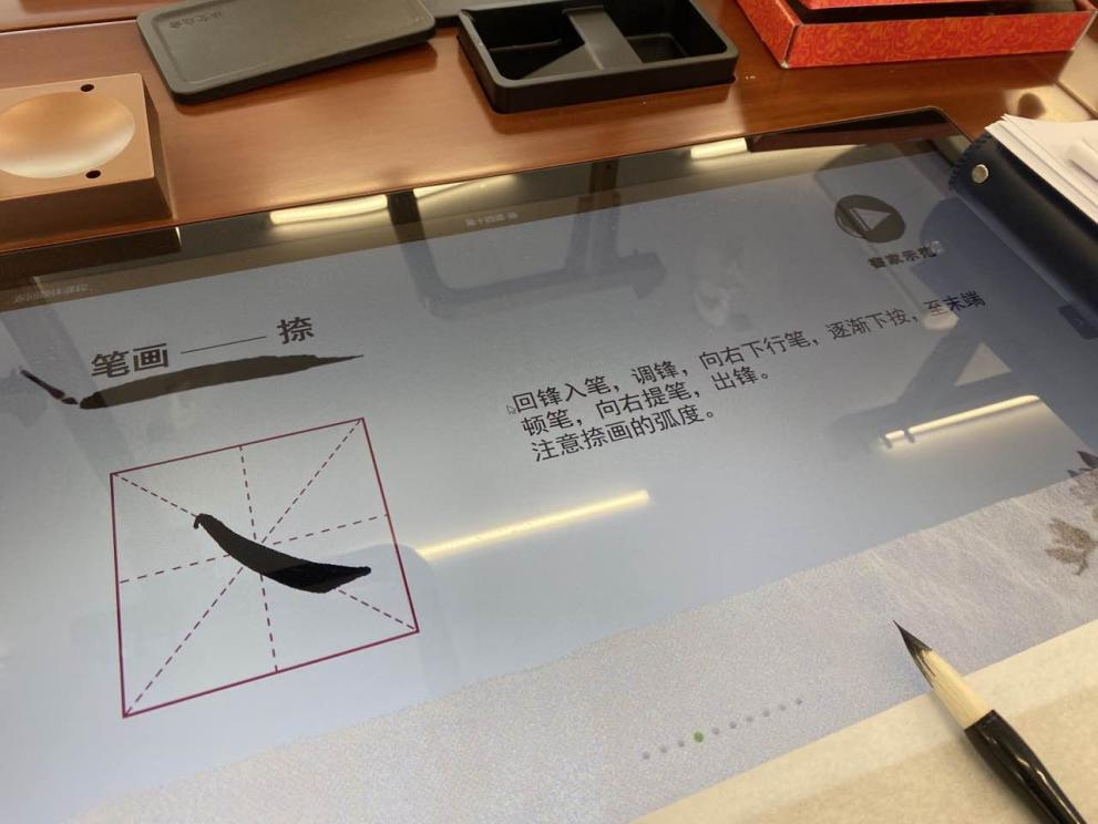在示范環節中,先進的基于人工智能Ai的筆尖跟蹤技術,為專業書法老師提供良好的示范工具,專業書法老師的書寫過程、運筆細節通過筆尖跟蹤技術可清晰地展現在學生端的交互式數字臨摹臺上,大大提高的示范效率,每一位學生都可以實時觀看。