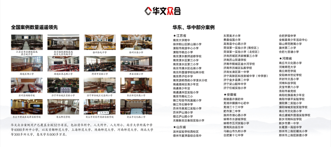 目前,華文眾合智慧書法教室已走進全國4000多所中小學以及300多所大學,包括清華大學附屬中學,中國人民大學附屬中學及附屬小學、首都師范大學等名校。在淮海經濟區(qū)擁有眾多優(yōu)質案例,包括南京大學附屬中學、江蘇省書法課程基地-燕子磯中學、濟南歷山雙語學校、合肥第十七中學、河南師范大學等。