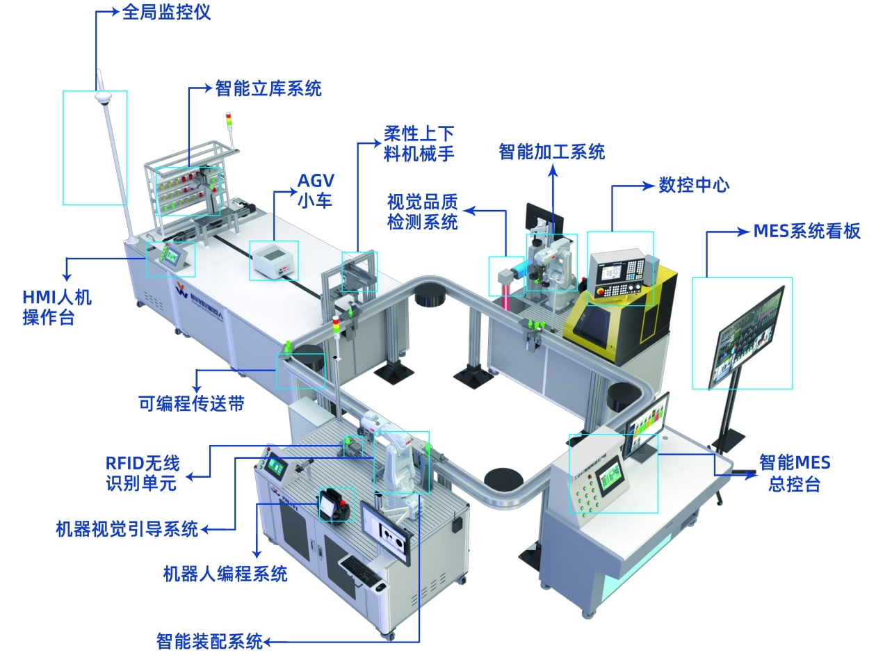 產(chǎn)品各組成單元 MES制造執(zhí)行系統(tǒng)在未來的工業(yè)4.0工廠里,智能設(shè)備、智能產(chǎn)品與智能管理系統(tǒng)相互交流,并與ERP、PLM、云數(shù)據(jù)等進(jìn)行通信聯(lián)絡(luò),構(gòu)成一個(gè)巨大的通信網(wǎng)絡(luò)。維視工業(yè)4.0 MES系統(tǒng)基于數(shù)據(jù)庫(kù)技術(shù),生產(chǎn)線的信息傳送過來后都存在系統(tǒng)的數(shù)據(jù)庫(kù)中,MES通過訪問數(shù)據(jù)庫(kù)對(duì)信息進(jìn)行處理和展示。同時(shí)我們還可以實(shí)現(xiàn)MES與ERP的對(duì)接以及其它系統(tǒng)的對(duì)接,實(shí)現(xiàn)更大面的信息共享。 智能立體倉(cāng)庫(kù)按實(shí)際立體倉(cāng)庫(kù)工作原理設(shè)計(jì),包括貨架、堆垛車、輸送線等部分,組成縮合性自動(dòng)化實(shí)訓(xùn)平臺(tái)。 ● 傳感器技術(shù) ● 人機(jī)介面 ● PLC控制 ● 電機(jī)驅(qū)動(dòng)技術(shù) ● 伺服系統(tǒng) ● Rfid技術(shù) ● 氣動(dòng)系統(tǒng) ● Wifi通信 ● 真空系統(tǒng) ● 標(biāo)準(zhǔn)接口 智能機(jī)器人裝配智能AGV機(jī)器人配合自動(dòng)料盒更換裝置,加上智能立體倉(cāng)庫(kù)實(shí)現(xiàn)完全智能的物流倉(cāng)儲(chǔ)功能。機(jī)器人技術(shù)應(yīng)用是未來工廠里的重要內(nèi)容,智能機(jī)器人裝配工站將機(jī)器人、機(jī)器視覺、PLC等集成在一起,構(gòu)成了一套全自動(dòng)化的智能生產(chǎn)系統(tǒng)。 ● 工業(yè)機(jī)器人 ● 電機(jī)控制 ●傳感器 ● 夾具設(shè)計(jì) ● 機(jī)器視覺 ● 機(jī)器人焊接 ● 安全保護(hù) ● 氣動(dòng)系統(tǒng) 智能加工MES是整個(gè)智能工廠的大腦,是收集信息、加工信息、處理信息的地方,通過與生產(chǎn)硬件的配合,實(shí)現(xiàn)智能化的生產(chǎn)過程。在未來工廠內(nèi),智能化的加工設(shè)備通過與產(chǎn)品通信,得到產(chǎn)品需要加工的內(nèi)容,自動(dòng)按照要求的加工內(nèi)容進(jìn)行定制化加工,這樣的場(chǎng)景在這里也得到了展現(xiàn)。 ● 智能激光打標(biāo)加工 ● wifi通信 ● 網(wǎng)絡(luò)通信 ● 個(gè)性化加工 ● RFID