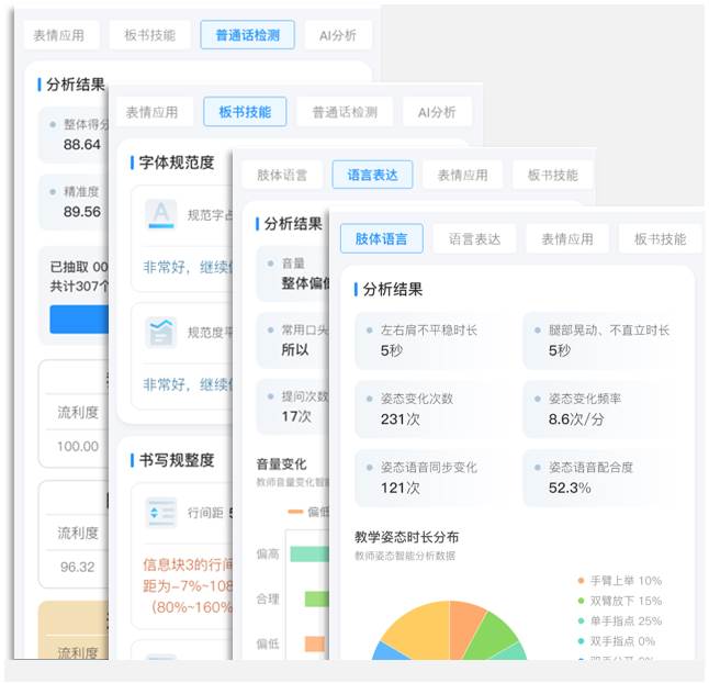 系統(tǒng)從肢體語(yǔ)言、語(yǔ)言表達(dá)、表情應(yīng)用、板書技能、普通話等五項(xiàng)基本技能對(duì)教師授課過(guò)程進(jìn)行全方位的診斷。每一項(xiàng)基本技能都包含了多個(gè)評(píng)價(jià)指標(biāo),例如:肩部、腿部平穩(wěn)度和姿態(tài)變化,語(yǔ)音、語(yǔ)速、口頭語(yǔ),表情種類和表情極性,板書的字體規(guī)范、書寫規(guī)整度和色彩應(yīng)用,普通話的流利度、精準(zhǔn)度等等。