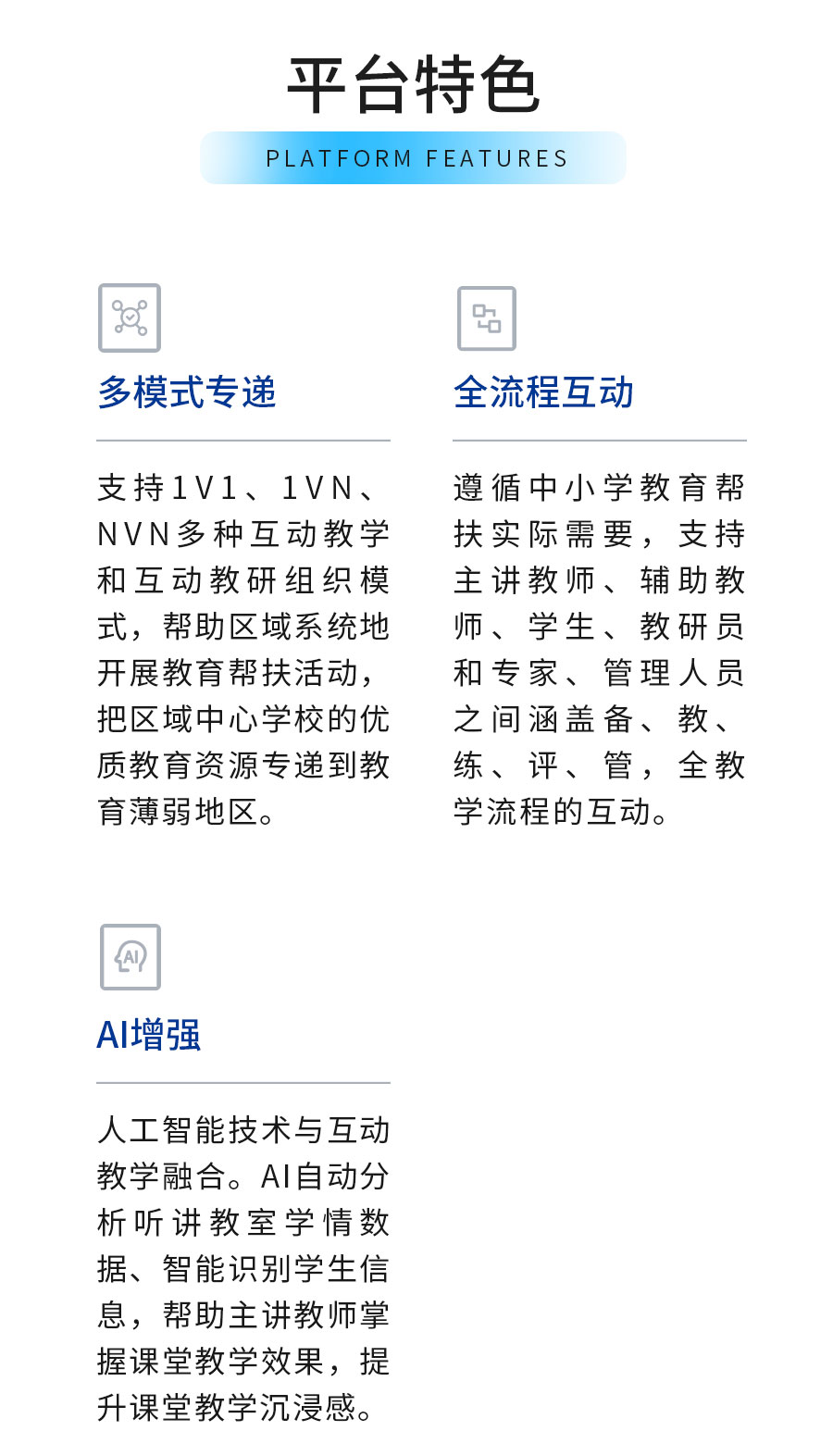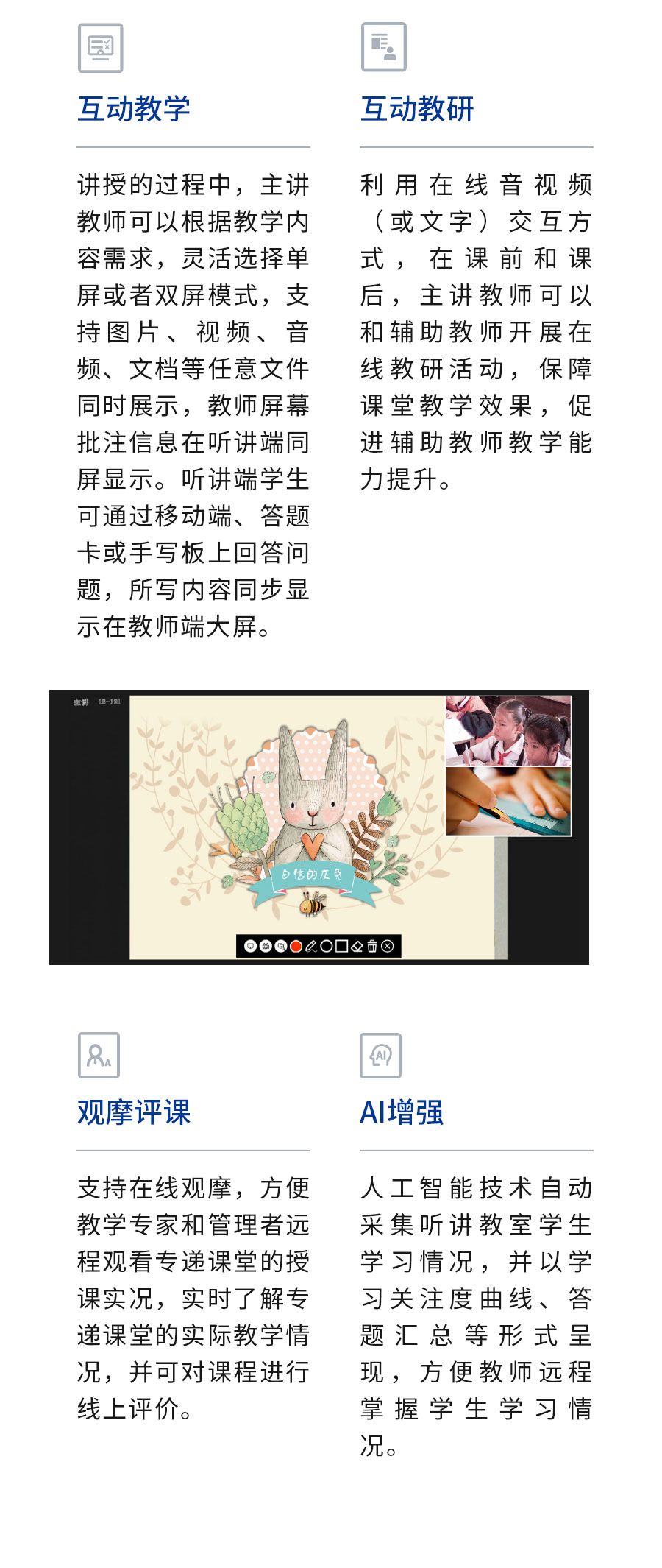 AI教研應用、錄播系統、智慧教室、“三個課堂”解決方案等 |