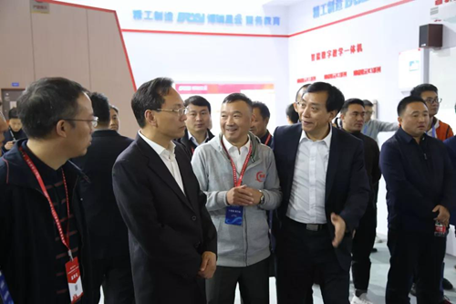 四川博瑞星云信息技術(shù)有限公司董事長王建華(右二)向蒞臨博瑞星云展位的四川省委教育工委書記、省教育廳黨組書記、廳長李江(左二)、四川省教育廳技術(shù)物資管理指導(dǎo)中心主任劉漢濤(右一)進(jìn)行參展智慧校園建設(shè)方案匯報(bào)。