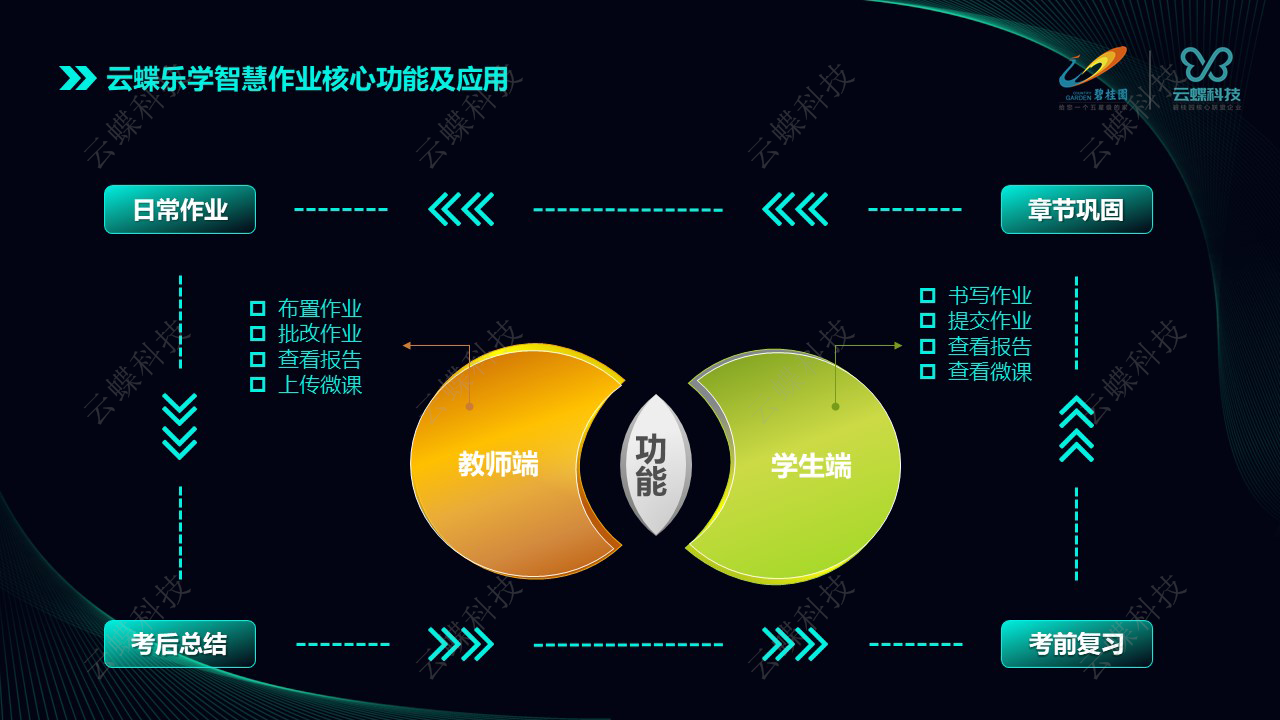 云蝶樂學智慧作業是通過點陣筆+AI技術來解決作業的問題,可實現日常作業、章節鞏固、考前復習、考后作業這樣幾個場景的功能。
