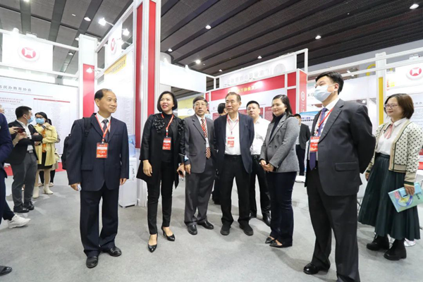 開幕式后,李連寧副秘書長、趙康會長在我校盧彩鳳董事長、品牌運營總監姚錦鑫陪同下來到我校展位參觀,為我校在推進職業本科教育試點工作上取得的成果點贊。