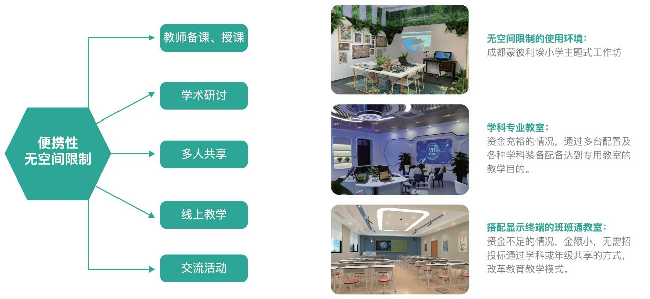 雖然VR憑借其獨(dú)特優(yōu)勢,賦能教育,將虛擬現(xiàn)實(shí)技術(shù)與教學(xué)進(jìn)行了充分融合,突破了傳統(tǒng)教學(xué)模式,實(shí)現(xiàn)了情境式教學(xué),讓學(xué)生沉浸在可交互的虛擬學(xué)習(xí)場景中,體會與知識進(jìn)行對話的樂趣。但眾所周知,受技術(shù)限制,VR并不能實(shí)現(xiàn)隨時隨地置身教育。