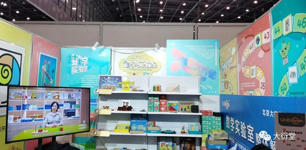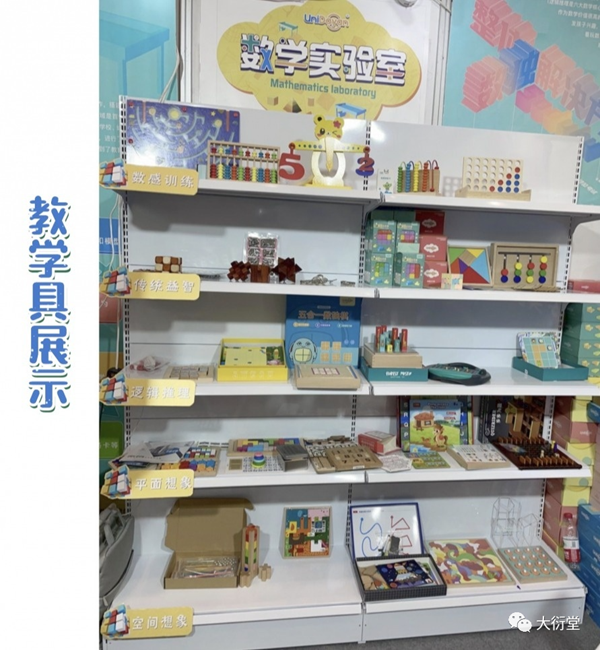 在本次大衍堂展位中,我們搭建展出了創(chuàng)新數(shù)學(xué)教育研發(fā)設(shè)計(jì)的教學(xué)產(chǎn)品和服務(wù)。從“數(shù)學(xué)實(shí)驗(yàn)室”場(chǎng)景的文化墻設(shè)計(jì)、空間營造、掛圖和模型展示,到沙盤桌等硬件教具設(shè)施,并將課程配套學(xué)具以數(shù)學(xué)價(jià)值進(jìn)行分類展示。