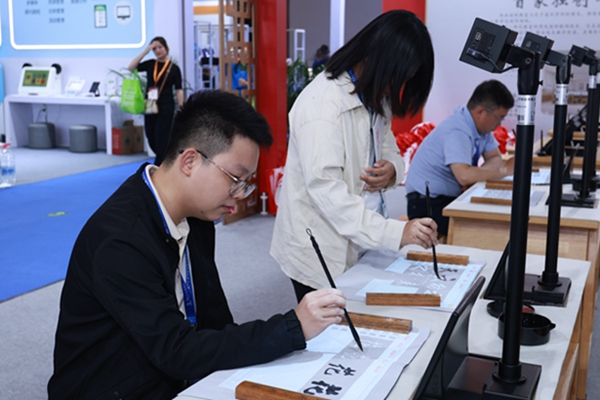 本屆展會文興主要帶來了智慧書法教室,智慧美術教室,智慧沙畫教室,數字棋藝教室。而這次展會的產品亮點和特色,是書畫投射臨摹臺和書畫創(chuàng)新教室。書畫投射臨摹臺是利用5G無線傳輸技術和投影技術集成的一款新產品,將教師中控機,書法視頻、圖片,課件內容等一鍵同屏于學生桌面。能高清觀看字帖,學習臨摹書法,投射尺寸從21.5寸至108寸之間,投射面積擴,完全滿足大畫面臨摹和大畫面播放要求。書畫創(chuàng)新教室,能實現書法美術一體化建設,能滿足書法教學的前提,又能滿足美術繪畫要求。本款產品的亮點,就是可實現上下升降功能,可實現軟筆,硬筆,粉筆等教學需要。