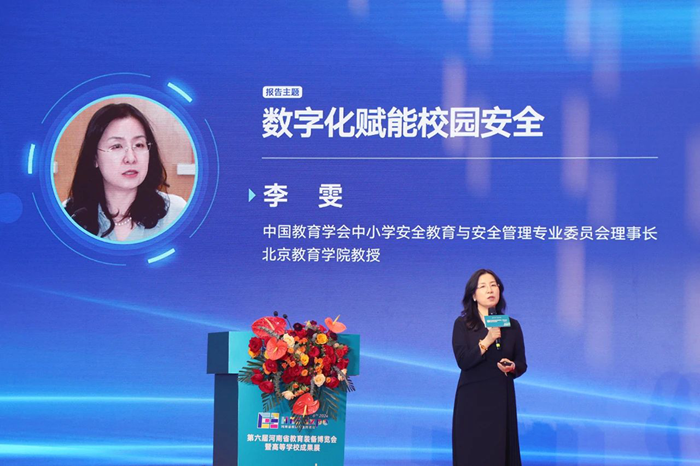 中國教育學會中小學安全教育與管理專業委員會理事長李雯向現場嘉賓作了“數字化賦能校園安全”主題報告,她指出:利用人工智能、大數據、物聯網等數字化技術,為學生構建更人性、智能、輕松、便捷的在校生活環境,將是未來教育數字化發展的重要方向。