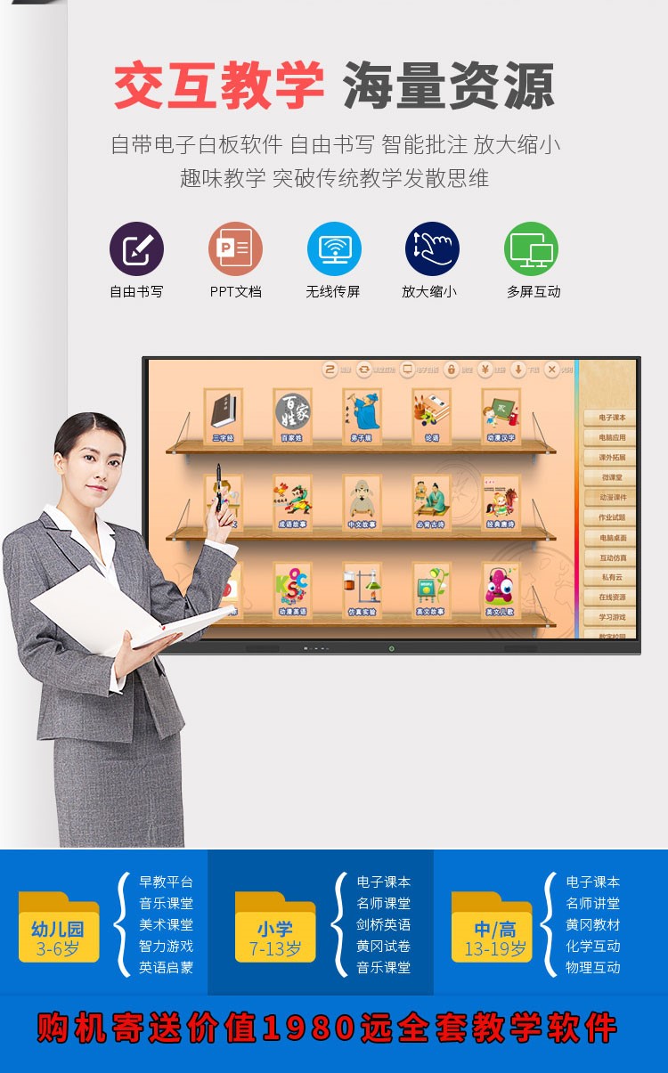 產(chǎn)品功能優(yōu)勢 1、雙系統(tǒng)Windows/Android,一鍵切換; 2、海量教學(xué)資源,從幼兒園到大學(xué)應(yīng)有盡有,滿足多元化教學(xué)需求; 3、六合一,強(qiáng)勁功能,集投影儀、幕布、電腦、電子白板、平板、音響于一體; 4、教學(xué)應(yīng)用,興趣教學(xué)。逼真貼近教學(xué)應(yīng)用,電子教學(xué)上課更輕松; 5、智能批注,未來教學(xué), 解決教學(xué)問題,讓你更輕松; 6、多人同屏,輕松互動(dòng),傳屏雙向操作,擁有教學(xué)會(huì)議多人同屏功能; 7、掃碼帶走,課件下載,手機(jī)掃一掃課件二維碼,輕松把它帶回家; 8、無線投屏,教學(xué)更輕松,互動(dòng)更頻繁; |