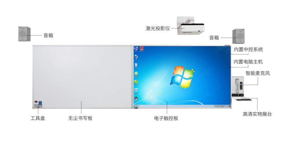 產(chǎn)品詳細介紹宏大智慧白板(交互式電子白板一體機雙拼組合):高度集成無塵書寫板、電子觸控板、音箱、多媒體設(shè)備(控制終端、中控系統(tǒng)、功放、高清實物展臺),整體厚度不大于110mm,無塵書寫板外觀尺寸90-150寸;