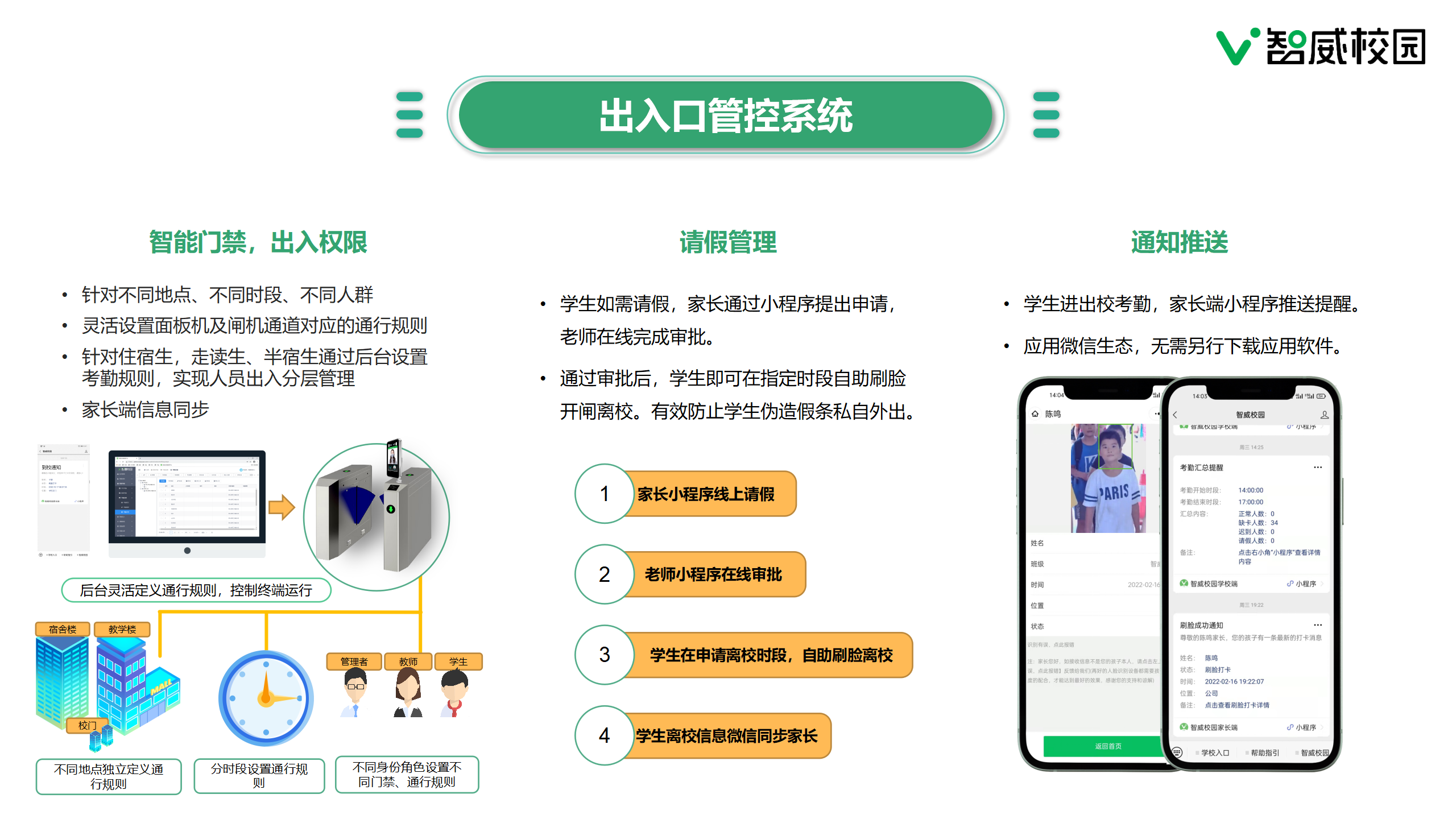 產(chǎn)品詳細介紹智能門禁,出入權(quán)限 針對不同地點、不同時段、不同人群 靈活設置面板機及閘機通道對應的通行規(guī)則 針對住宿生,走讀生、半宿生通過后臺設置考勤規(guī)則,實現(xiàn)人員出入分層管理 家長端信息同步