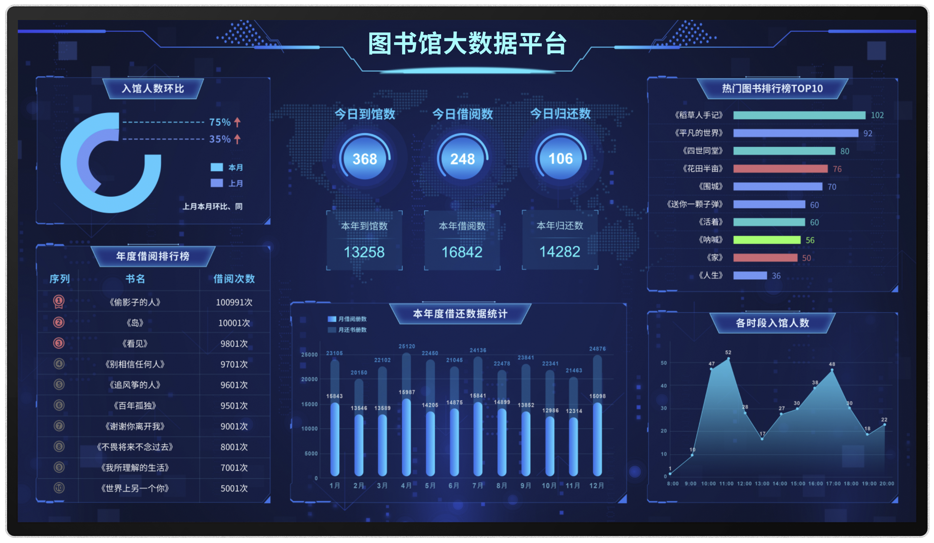產(chǎn)品詳細(xì)介紹1、可展示圖書館的預(yù)設(shè)圖片 2、實時展示圖書館的業(yè)務(wù)數(shù)據(jù),包括日借閱人數(shù)、今日借閱量、總借閱量、今日辦證數(shù)、總辦證數(shù)、館藏總數(shù)、到館人次等常用數(shù)據(jù) (展示內(nèi)容需要可調(diào)整) 3、滾動展示圖書館所設(shè)置的公告、通知等文字信息 4、實時展示今日借閱圖書冊數(shù)線性圖 5、展示圖書館最新借閱圖書