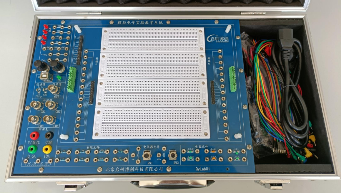 產(chǎn)品詳細(xì)介紹(一)實(shí)驗(yàn)教學(xué)系統(tǒng)主要特點(diǎn): 1.實(shí)驗(yàn)教學(xué)系統(tǒng)必須采用主實(shí)驗(yàn)箱+模塊化的結(jié)構(gòu)組合方式設(shè)計(jì);配有實(shí)驗(yàn)板安裝接口底座,實(shí)驗(yàn)板更換簡便;實(shí)驗(yàn)電路原理圖布局在PCB板頂層,方便測量和觀察設(shè)計(jì),多模塊集成,支持模擬電子電路系統(tǒng)設(shè)計(jì)與性能驗(yàn)證,學(xué)生不用插各種芯片和進(jìn)行復(fù)雜連線,提升實(shí)驗(yàn)效率; 2.實(shí)驗(yàn)教學(xué)系統(tǒng)必須便攜式結(jié)構(gòu)、移動靈活,箱體尺寸小于55×35×15cm,重量低于5kg;不受實(shí)訓(xùn)室場地限制,方便開展隨堂實(shí)驗(yàn)、技能培訓(xùn)、電子競賽等多種活動; 3.實(shí)驗(yàn)教學(xué)系統(tǒng)實(shí)驗(yàn)板的每個(gè)實(shí)驗(yàn)?zāi)K單元均由電路原理圖和電路實(shí)物兩部分組成,二者對應(yīng),便于電路直觀識圖,理論與實(shí)踐結(jié)合; 4.各個(gè)模塊均配有電源(帶LED指示)接線端口、地接線端口,輸入、輸出、地接線柱及各功能測點(diǎn)接線柱,方便連線操作和接入測試探頭; 5.提供教學(xué)樣例實(shí)驗(yàn)程序及軟件免費(fèi)升級服務(wù),并做好培訓(xùn)工作,培訓(xùn)時(shí)間不少于2天,免費(fèi)質(zhì)保期叁年。 (二)實(shí)驗(yàn)教學(xué)系統(tǒng)底板技術(shù)指標(biāo); 1.提供4個(gè)示波器通道;配有標(biāo)準(zhǔn)的BNC接口,帶寬100MHz,實(shí)時(shí)采樣率1GSa/s; 2.提供1個(gè)波形發(fā)生器:配有標(biāo)準(zhǔn)的BNC接口,信號輸出頻率范圍:DC 1Hz~25MHz,波形幅度:±3.5Vmax; 3.提供萬用表:配有標(biāo)準(zhǔn)的接口,直流電壓量程800V,電流測量量程10A,二極管測量范圍2V; 4.提供波形校準(zhǔn)源; 5.上述所提供的各儀器均可與PC機(jī)連接; 6.提供面包板:面包板尺寸170*138mm; 7.直流電源:電源輸出:+5V、-5V、+12V、-12V; 8.可調(diào)直流電源:0~12V,0~-12V; 9.實(shí)驗(yàn)系統(tǒng)電源帶有保護(hù)功能。 (三)實(shí)驗(yàn)內(nèi)容: 1.共發(fā)射極放大電路; 2.共集電極放大電路; 3.共基極放大電路; 4.多級放大及反饋電路; 5.差動放大電路; 6.場效應(yīng)管放大電路; 7.同相比例放大電路; 8.反相比例放大電路; 9.反相比例加法電路; 10.積分電路; 11.微分電路; 12.集成運(yùn)放兩級放大電路; 13.二階低通有源濾波電路; 14.二階高通有源濾波電路; 15.過零比較器電路; 16.遲滯比較器電路; 17.窗口比較器電路; 18.方波三角波發(fā)生器電路; 19.二極管限幅電路; 20.二極管穩(wěn)壓電路; 21.半波整流濾波電路; 22.全波整流濾波電路; 23.集成功率放大電路; 24.RC正弦振蕩電路; 25.LC振蕩電路; 26.串聯(lián)晶體管穩(wěn)壓電路; 27.三端集成穩(wěn)壓電源實(shí)驗(yàn)。 |