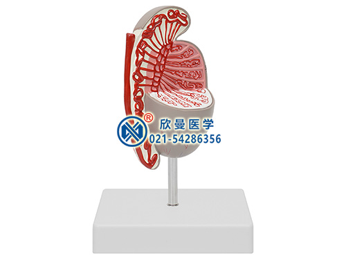 XM-716睪丸解剖放大模型顯示睪丸、附睪及輸精管,睪丸作剖面,在剖面上顯示睪丸白膜、睪丸小隔、鞘膜腔、睪丸小葉、精曲小管、附睪頭、睪丸輸出小管、附睪管、睪丸網(wǎng)、附睪體、附睪尾等外形。