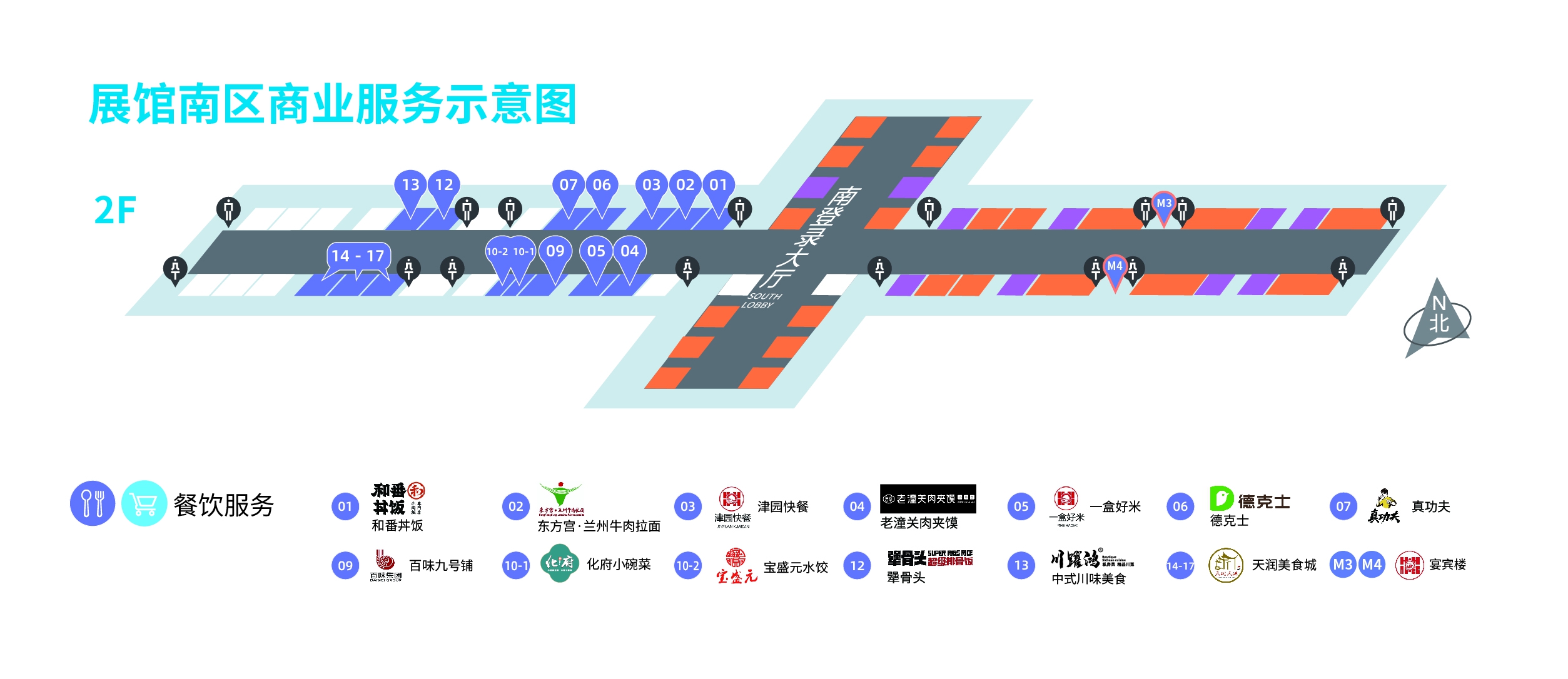 展館共設有餐飲商戶14家,西側二層堂食商鋪內及公區共設置就餐座位約5000個,提供就餐、休閑、洽談空間;宴賓樓位于東側通廊二層三層,提供團餐自助、商務桌餐服務。